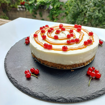 Ritkán készítek desszerteket, olyankor is inkább a sütés nélküliekre szavazok. Ez a sajttorta is ilyen, nagyon praktikus és egy láthatatlan része is van, amitől még finomabb lett. Ez pedig a vajas keksz alap és a citromleves és -héjas sajtkrém közé kerülő fahéjas cseresznye lekvár. Tetejére csorgattam egy kis karamell öntetet, amihez jól jött a ribizliszemek savanyúsága.